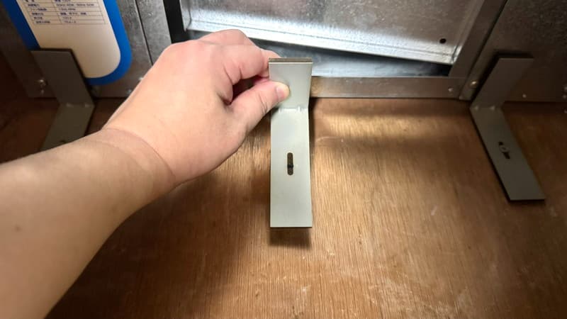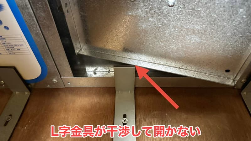これで扉が開くのですが、本体を固定しているL字金具が干渉して開きませんでした。