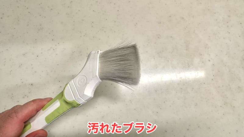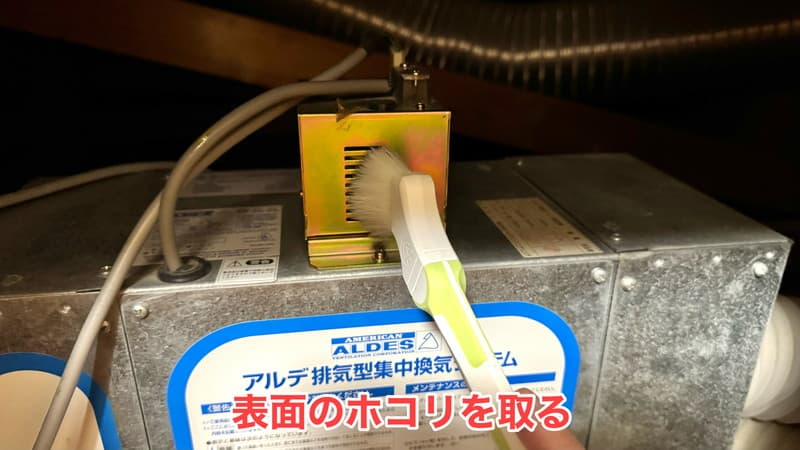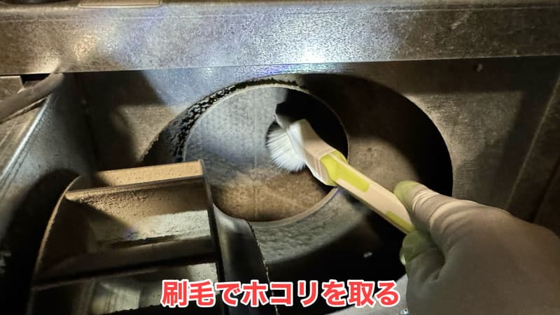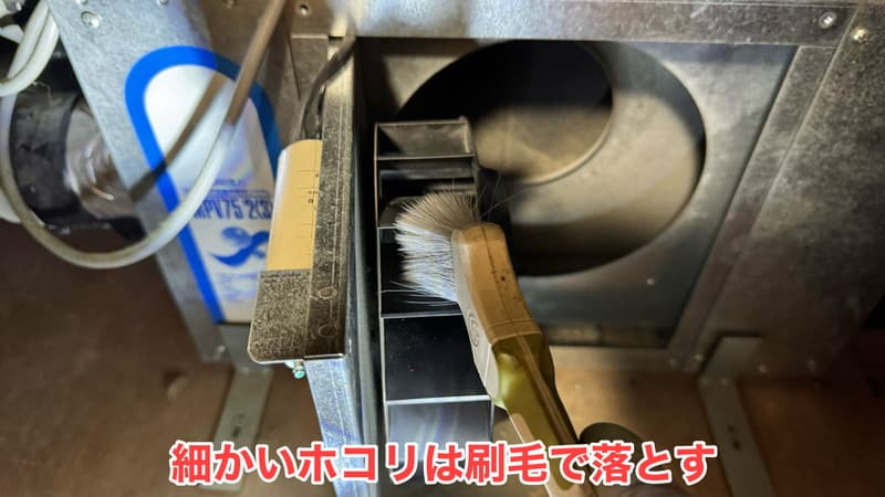 奥側のフィルターのほうから刷毛でホコリを落としていきます。(下に落ちたホコリは最後に回収します。)