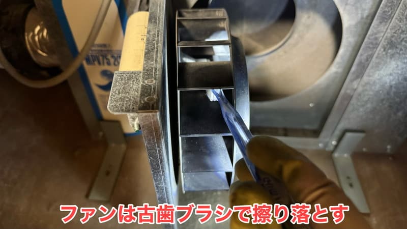 ファンは刷毛だと柔らかすぎてホコリを落としきれなかったので、「古歯ブラシ」を使いました。