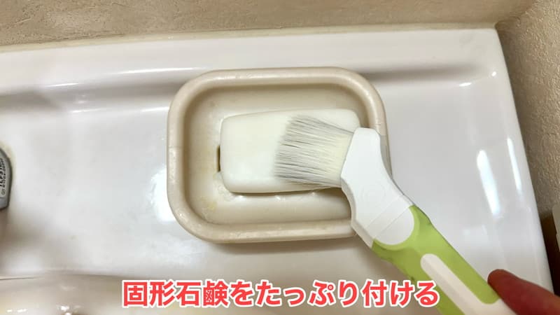 まず、毛先をお湯ですすいでから、固形石鹸をたっぷりとつけます。
