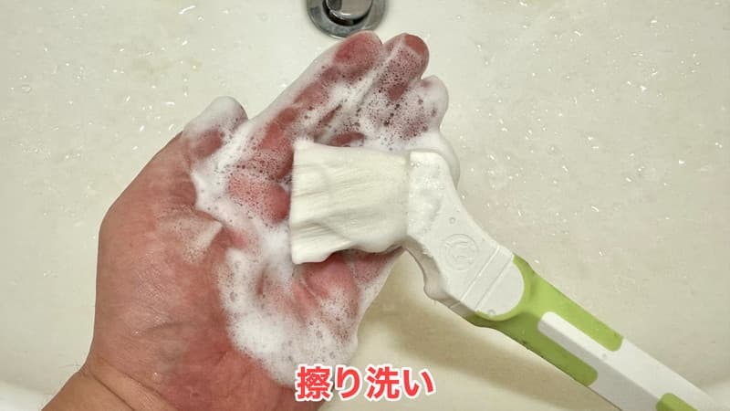 片方の手のひらで円を描いたり揉み込んだりして泡だてながら念入りに洗います。