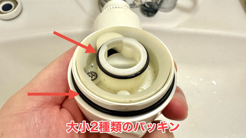 外してからシャワーヘッドをひっくり返すと、外側と内側に2種類のパッキンがあるのが分かります。