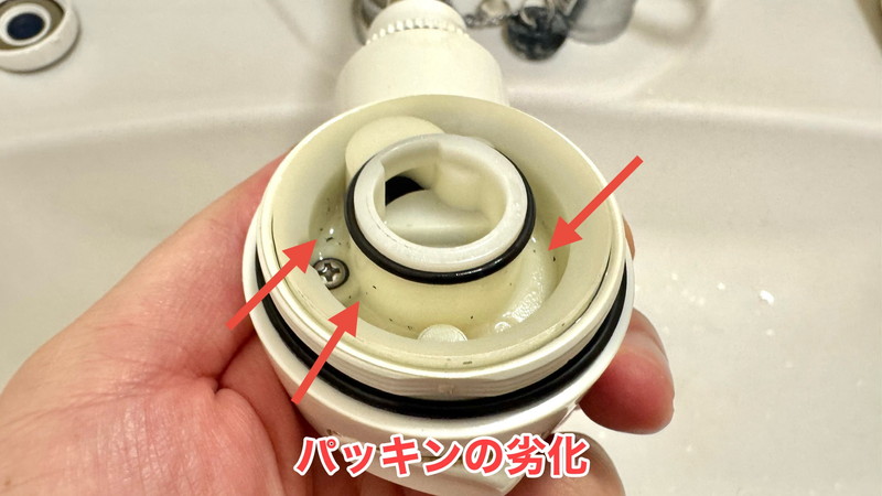 パッキンが劣化していると見られる現象で、ボロボロとカスが落ちている状態です。