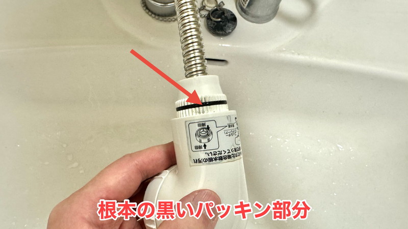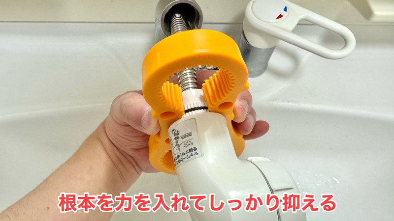 パッキンがある根本をしっかり抑えます。