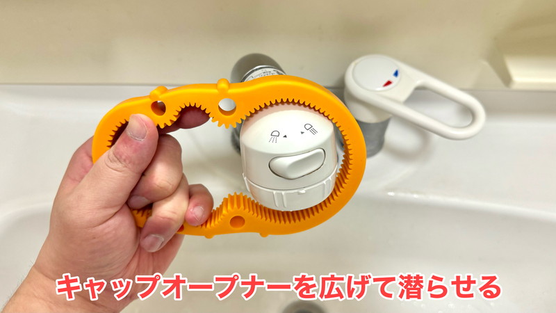 このキャップオープナーはゴム製なので、広げてシャワーヘッドを潜らせます。