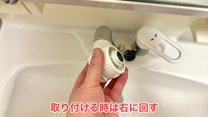 無事に外れたら、新しいシャワーヘッドを右(時計回り)に回して取り付けます。